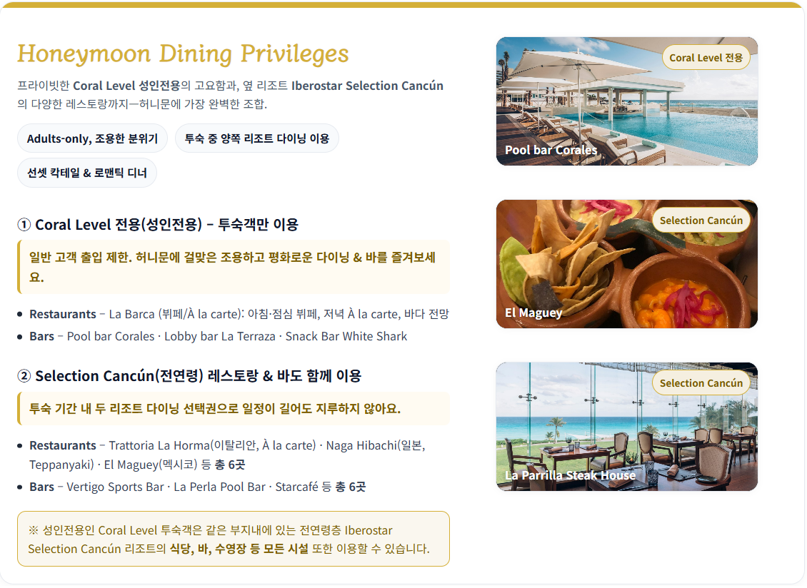 칸쿤의 눈부신 백사장에 자리한 Iberostar Selection Coral Cancun은 칸쿤 해변에 위치한 Iberostar Selection Cancun 리조트 내에 독립적으로 분리된 성인 전용(18+) 럭셔리 섹션으로, 허니문에 최적화된 리조트 입니다.